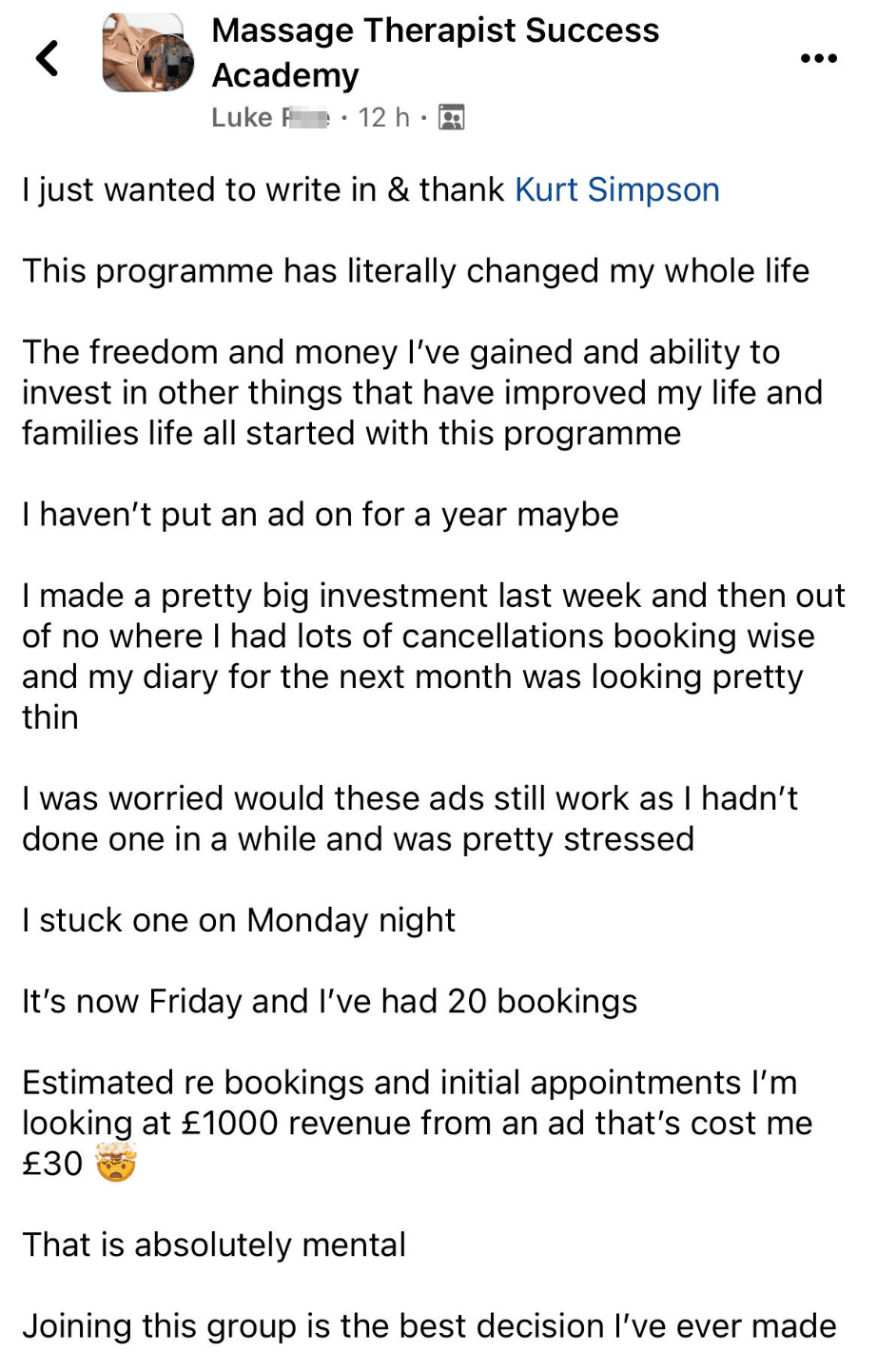 ***Note: This is not a 'Get Rich Quick' scheme. While members of the program have multiple bookings per day coming in within a few days of joining, it still takes time to build a great business and get proficient at booking clients in, getting them to show up, delivering great massages for those clients, and then rebooking them... along with many other parts to building a great business.