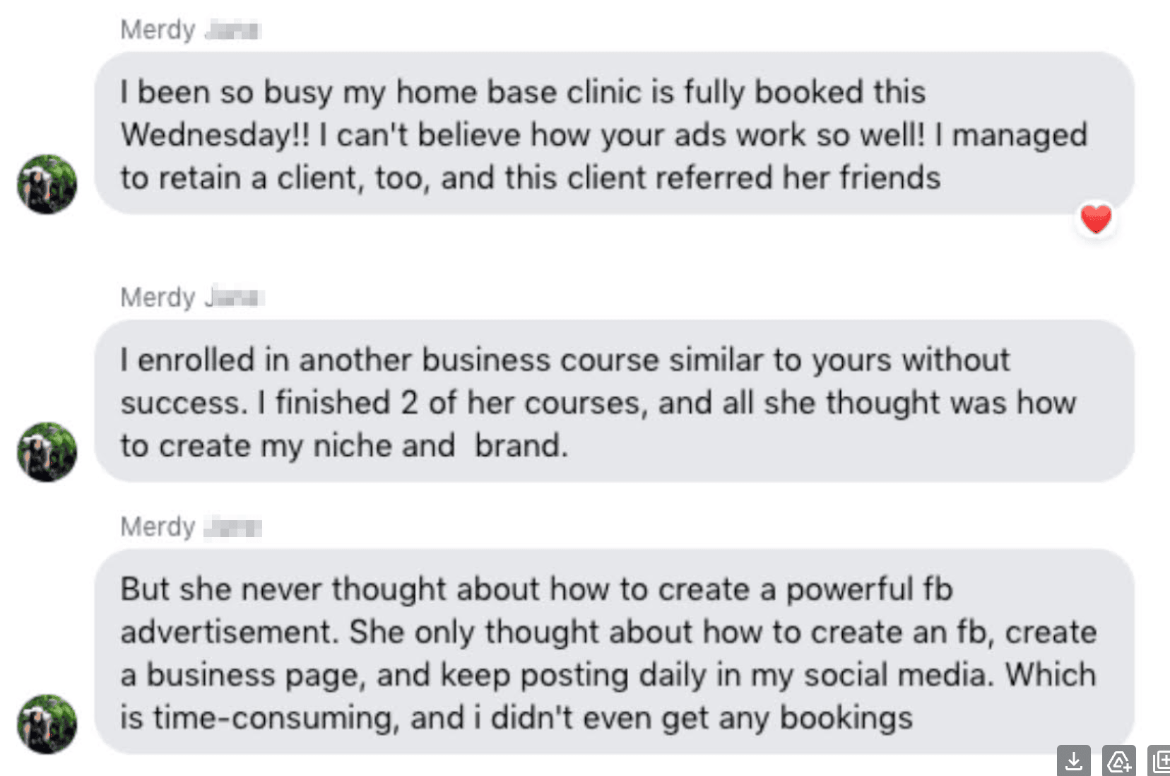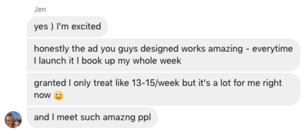 All thanks to figuring out a brand new system for building social media massage ads that now brings us in a constant flow of clients on demand.