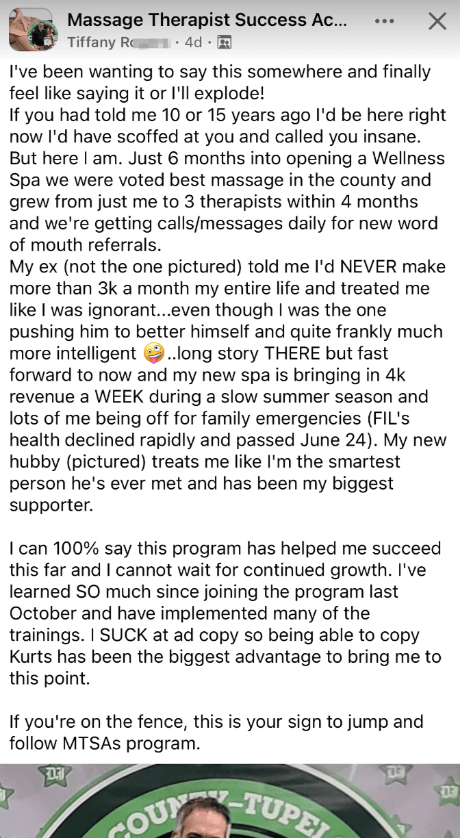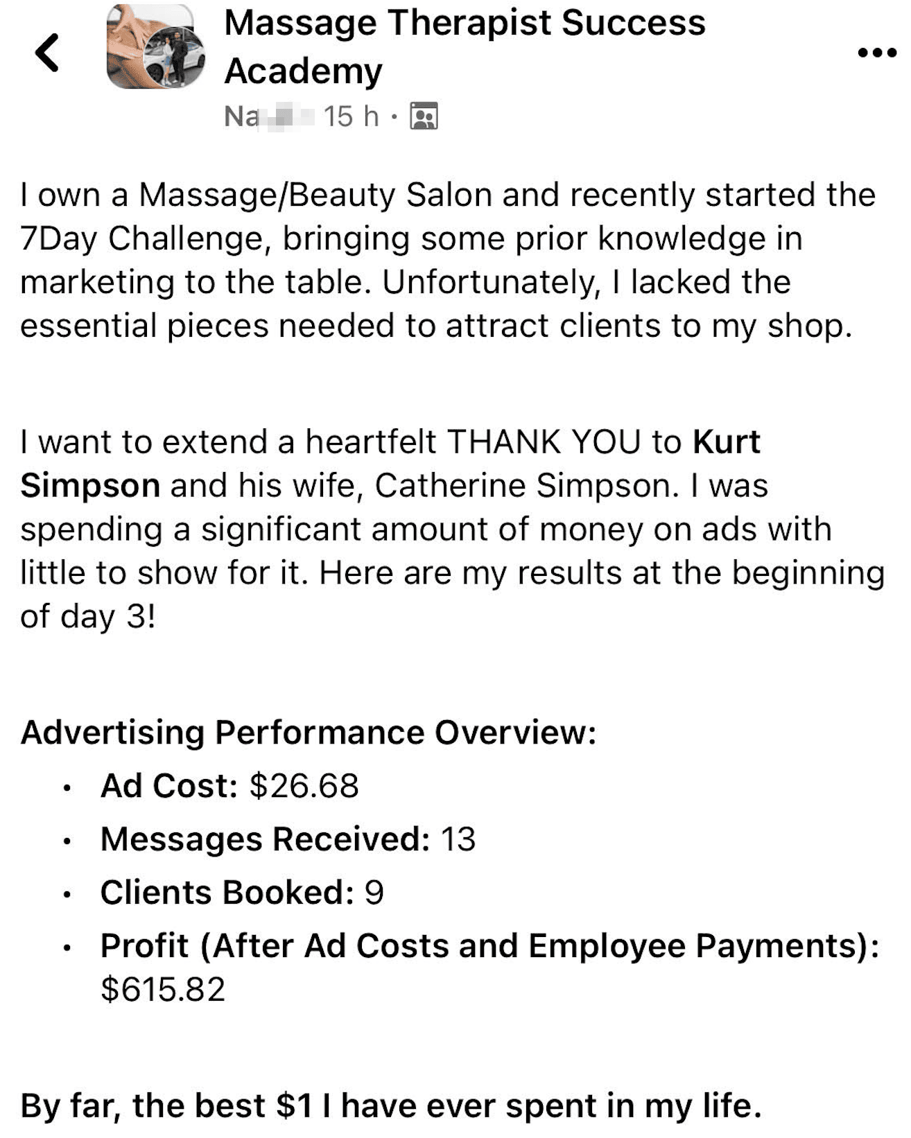 Just copy & paste my already-proven social media ads to grow your massage business, just as I did, going from 0 to 75 appointments per week in my 2-room Salon, then expanding and booking out 9 therapists In Our 7-treatment room location soon after.